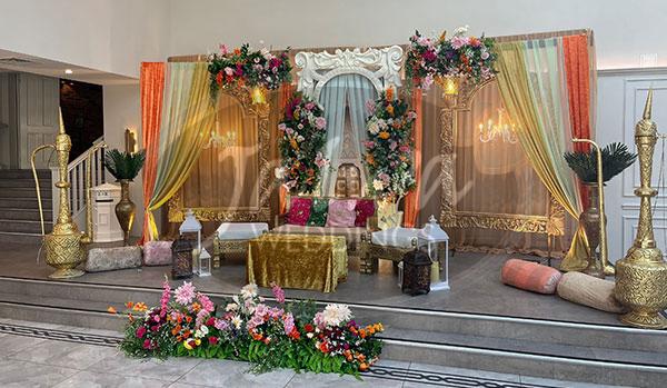 Beautiful and Elegant designs of Stages ranging from Swarovski Crystal Stages Bollywood, Arabian, and Moroccan theming to create the perfect atmosphere to host your extravagant event from mendhi décor to ladies sangeet décor to fully crafted Punjabi village themes.